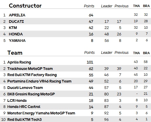 Le classement des championnats Constructeurs et Equipes :