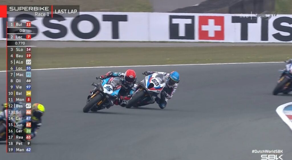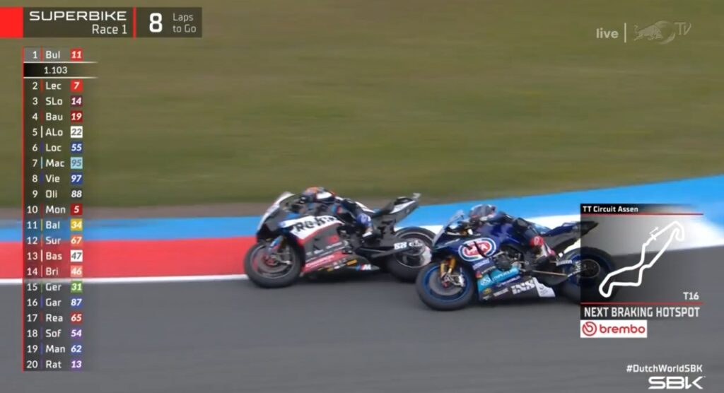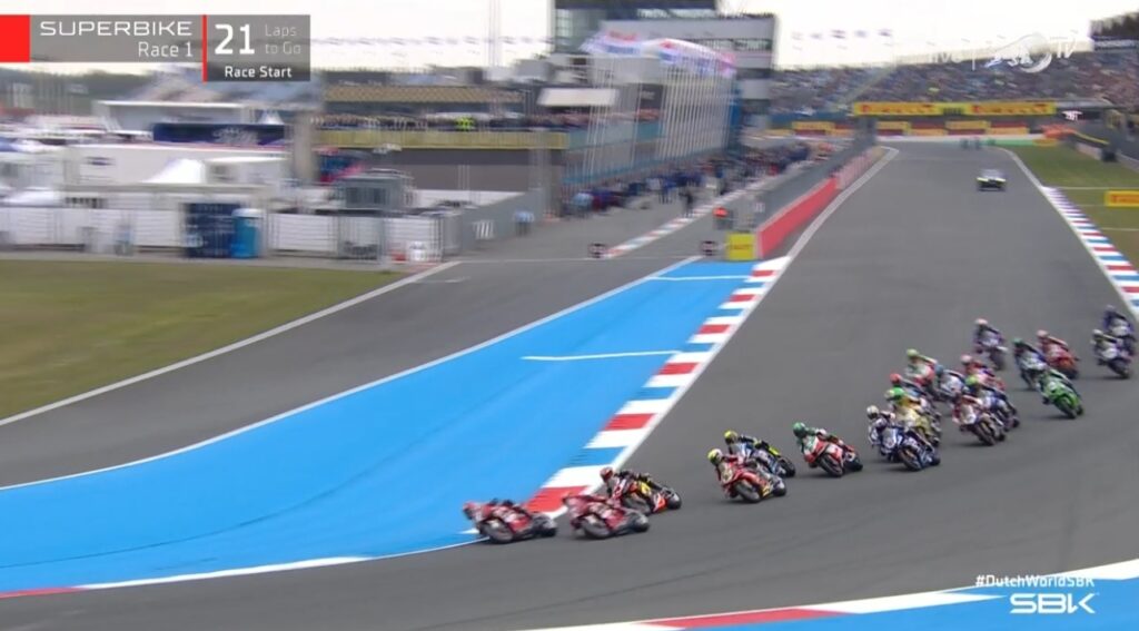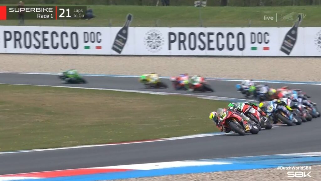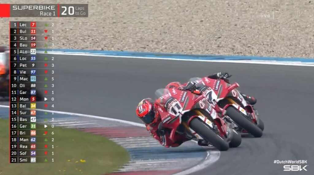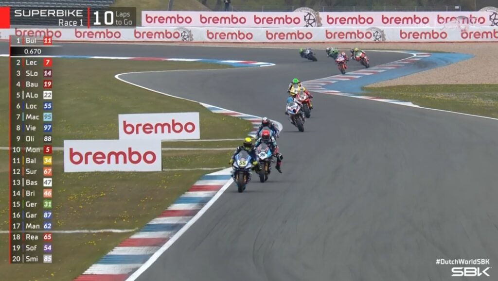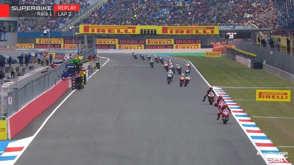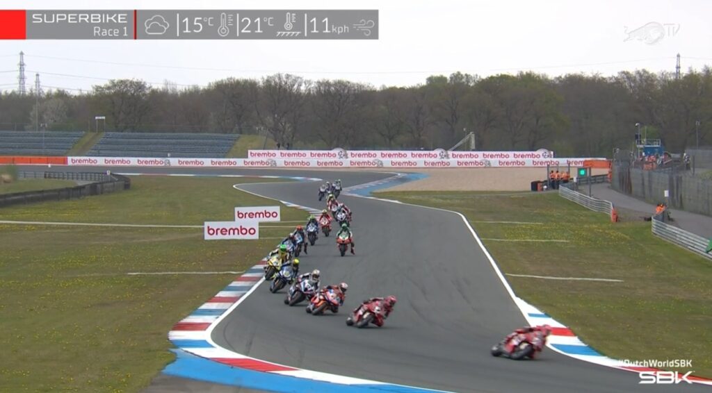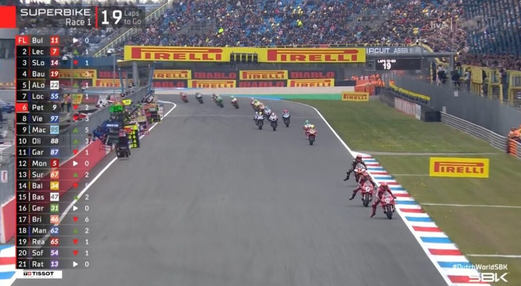 Petrucci va se rater à l’entrée du 1er long lap, il va dans le gravier et repart dernier.