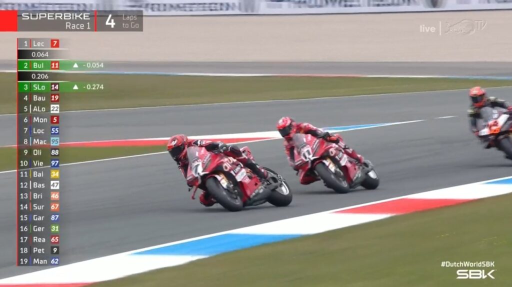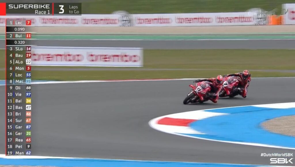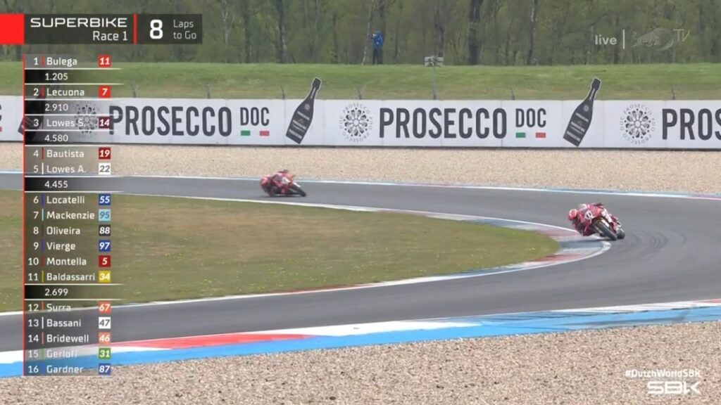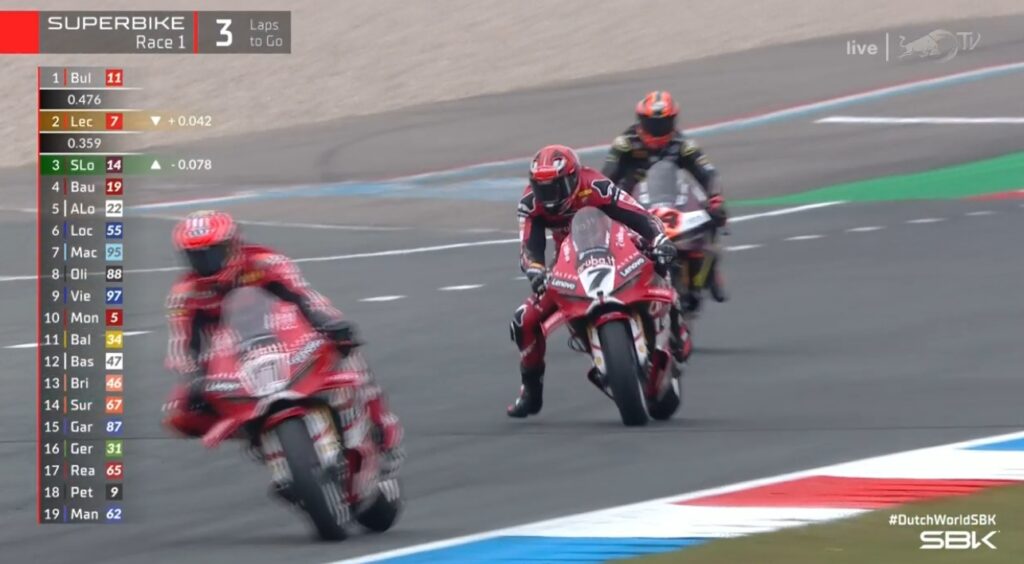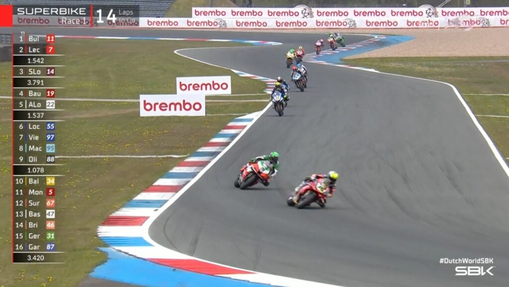 L’écart passe à 2″ mais tout d’un coup on ne comprend pas, sur le live timing on voit Lecuona revenir très vite sur Bulega et il le passe. En fait, des gouttes de pluie ont fait leur apparition et Bulega en tête sans point de repère a préféré assurer :