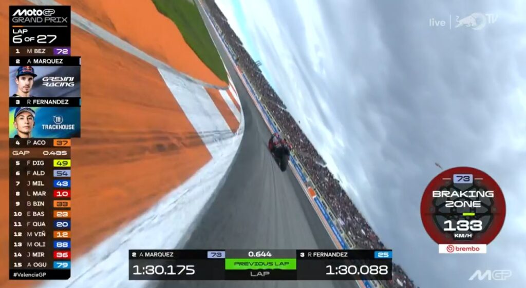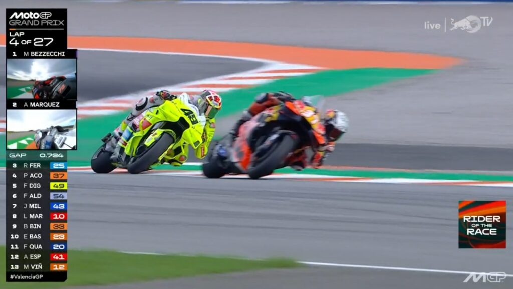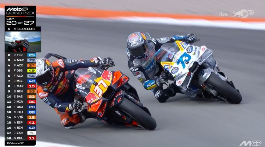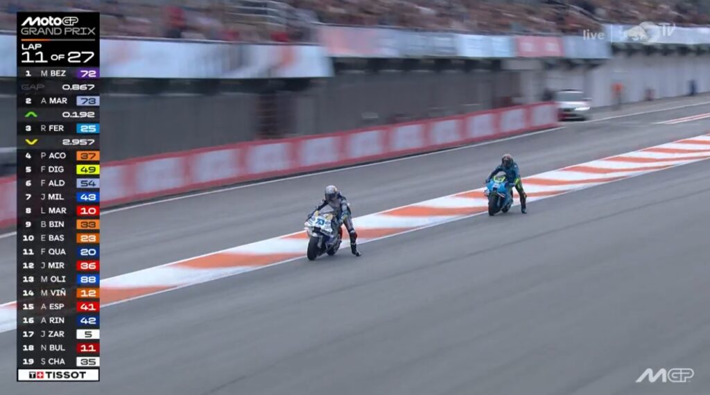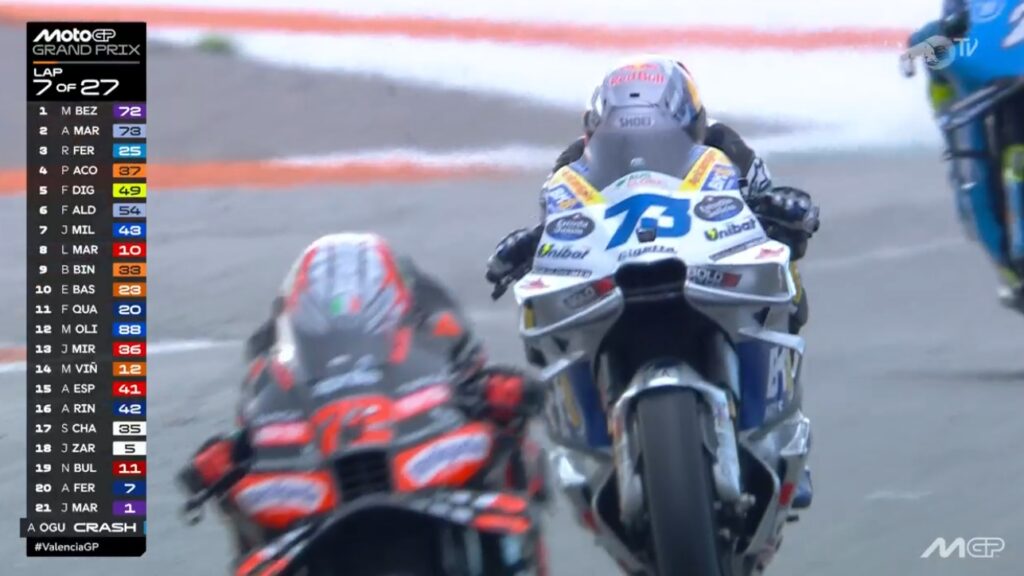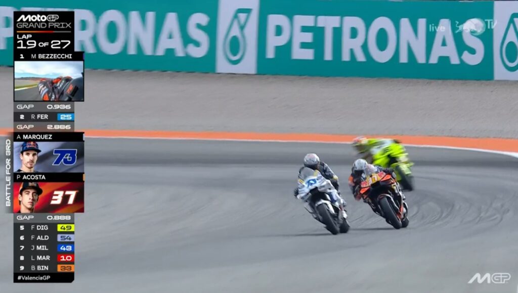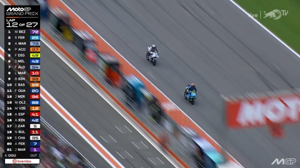 Au fond de l’écran, on voit Aldeguer qui a passé Marquez :
