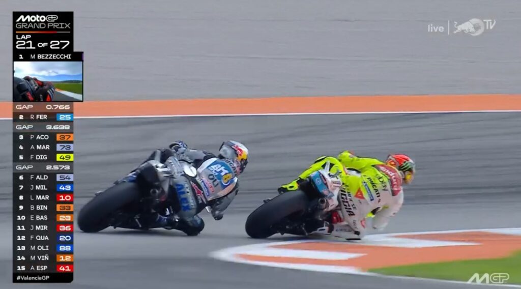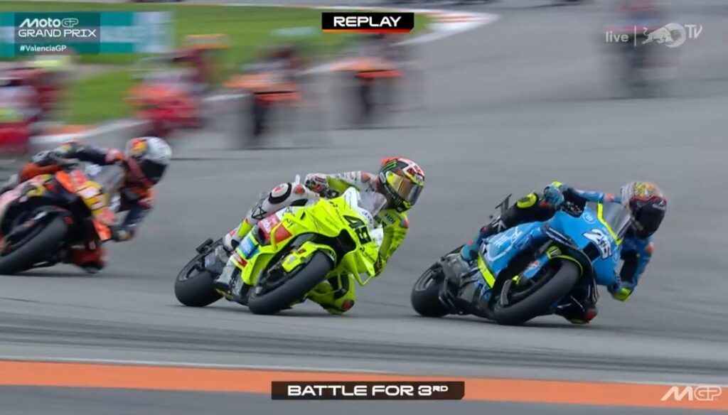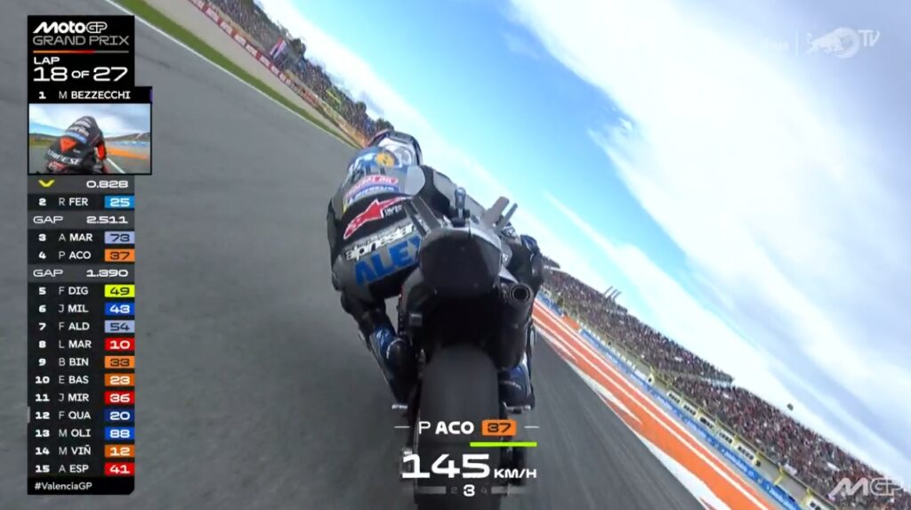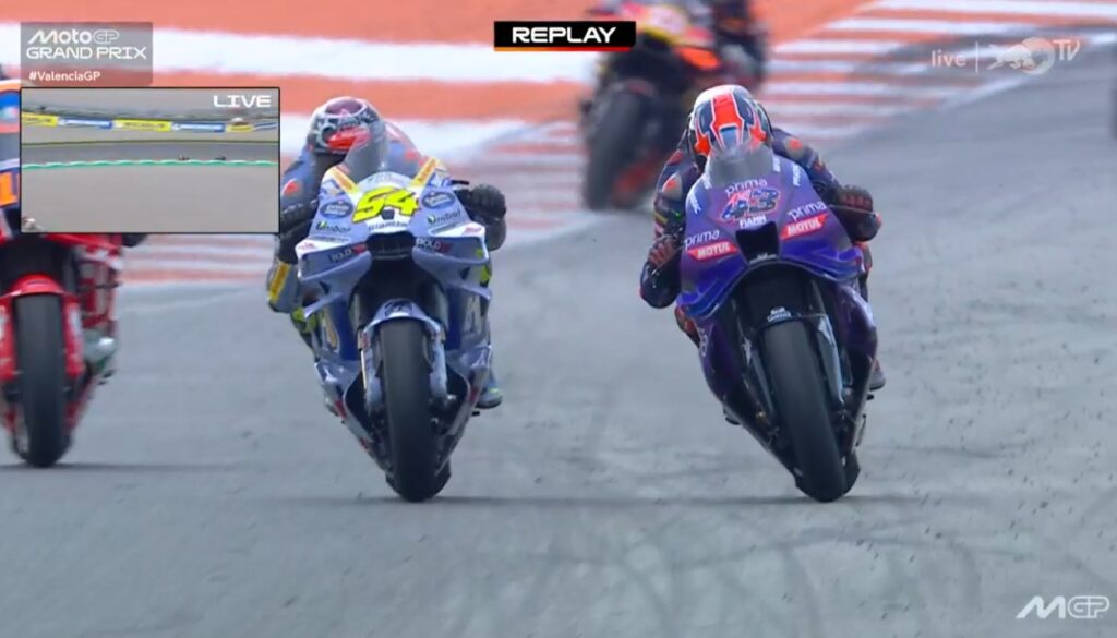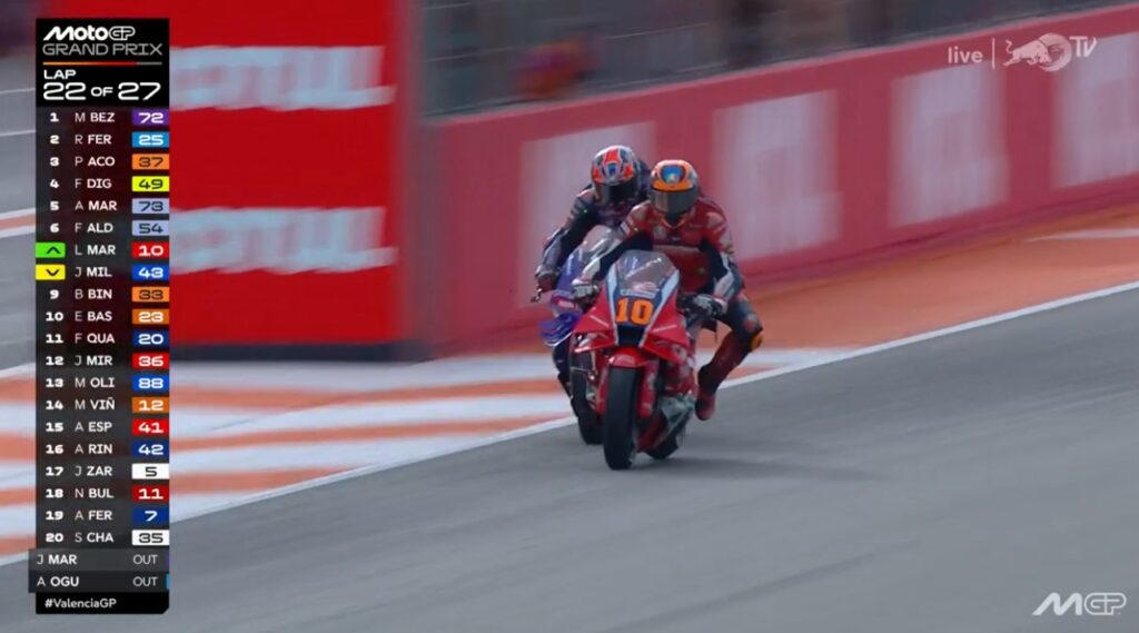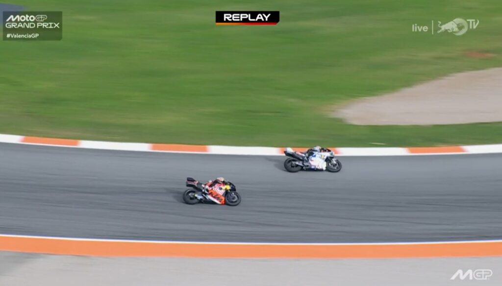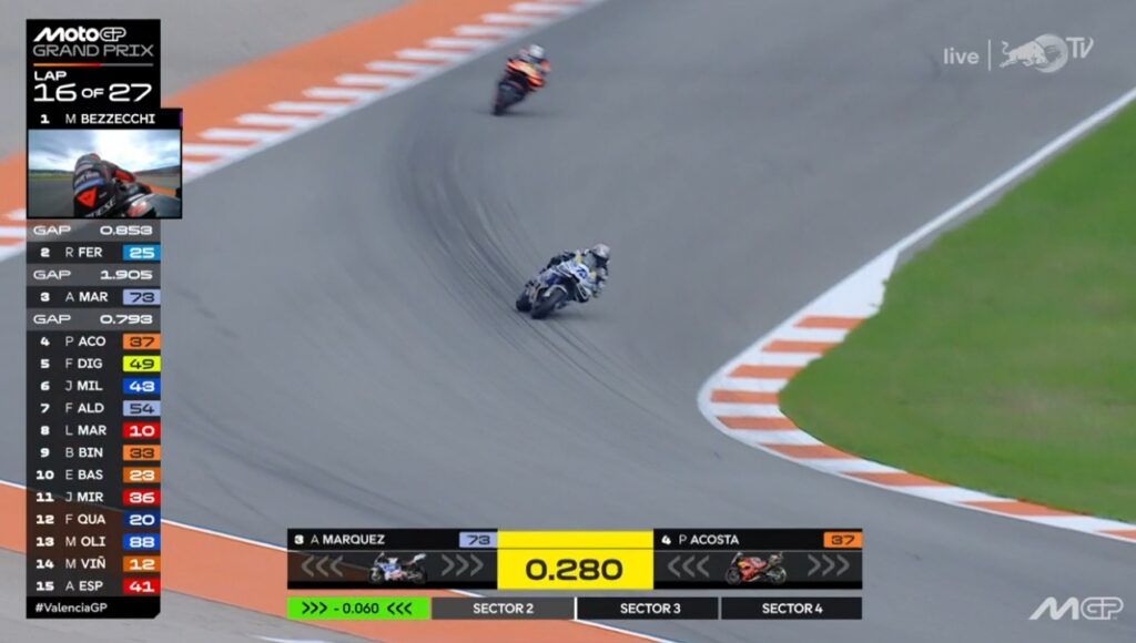 Au fond de l’écran, on voit Aldeguer qui a passé Marquez :