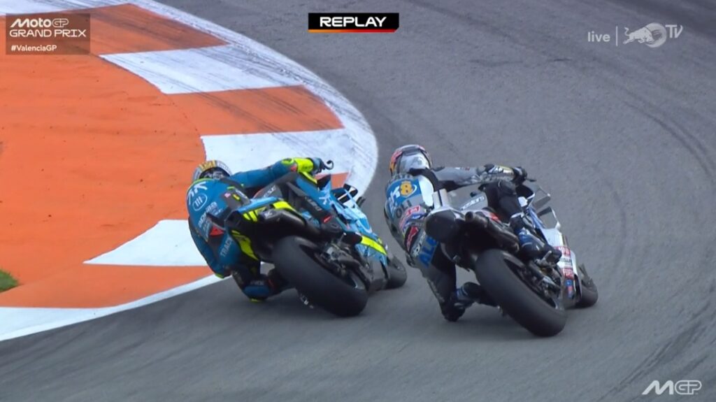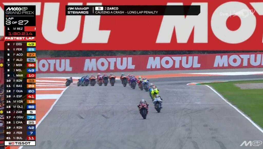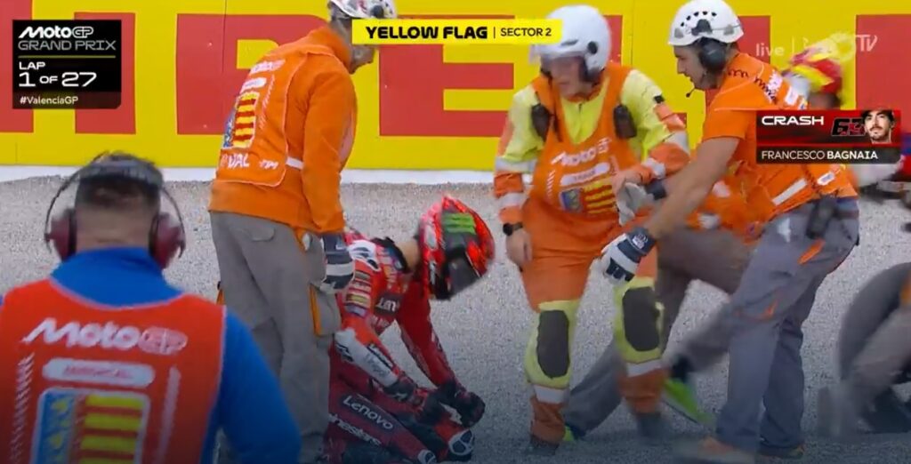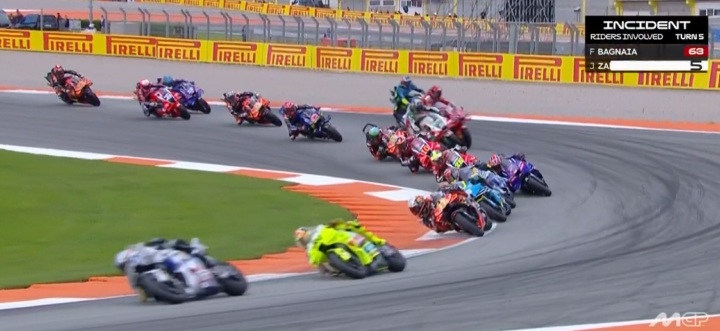Chute de Bagnaia après avoir été poussé par Zarco :