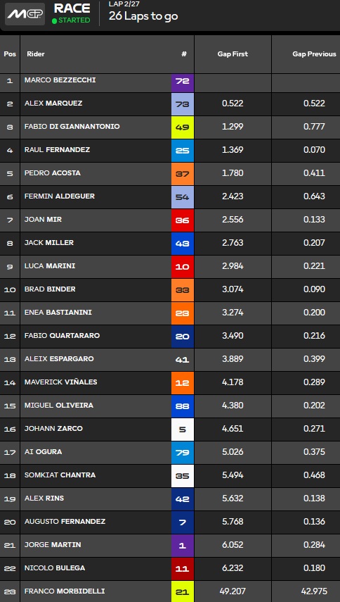Holeshot de Bezzecchi devant Marquez et Giannantonio :