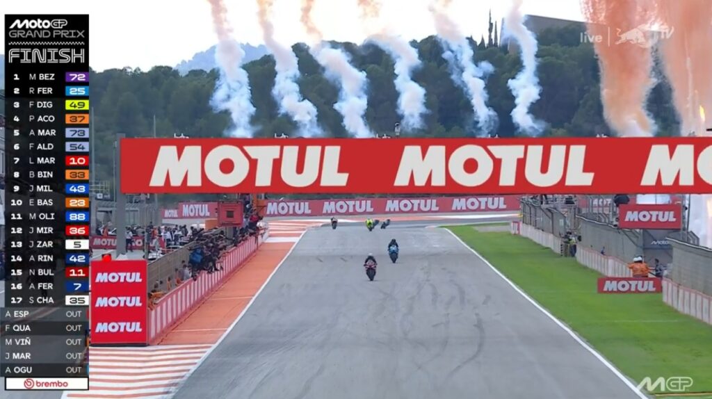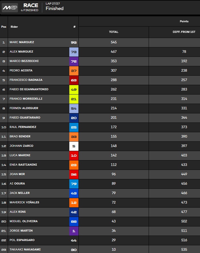 Et au championnat des Teams c’est les 2 motos, ainsi le HRC marque donc les 9 pts de Marini plus les 3 de Joan Mir, soit 12 pts.