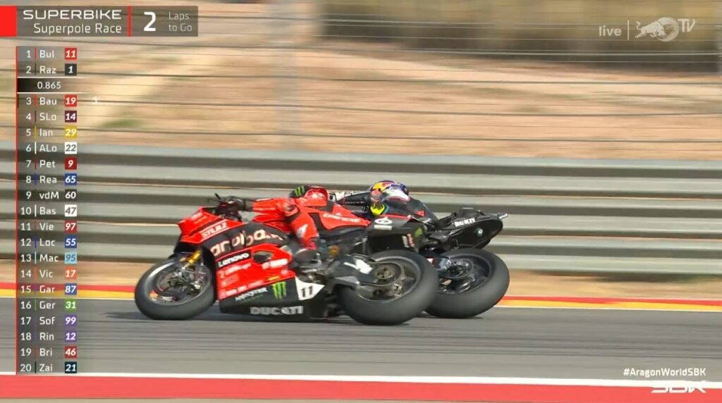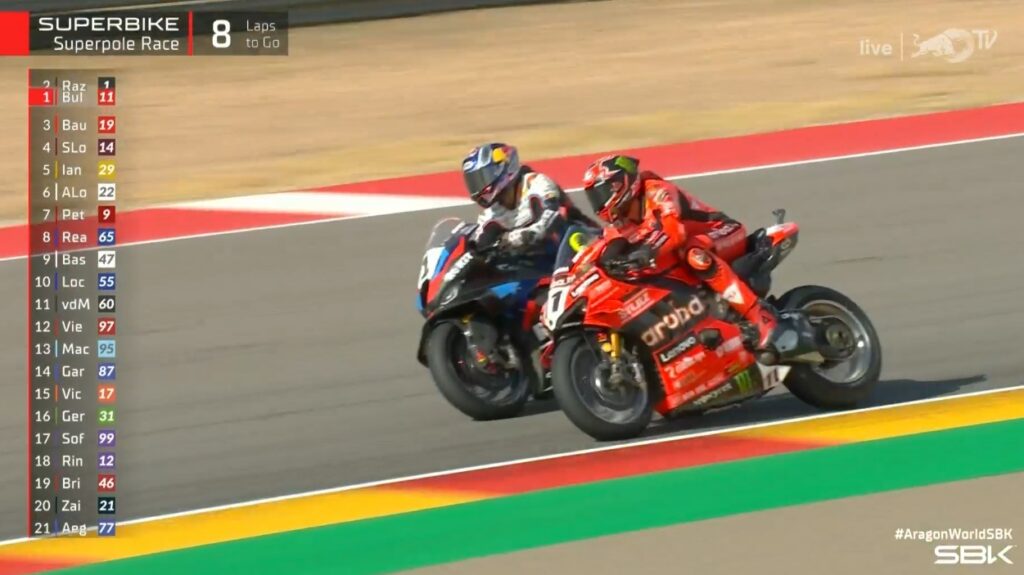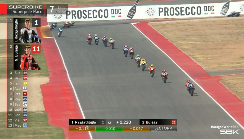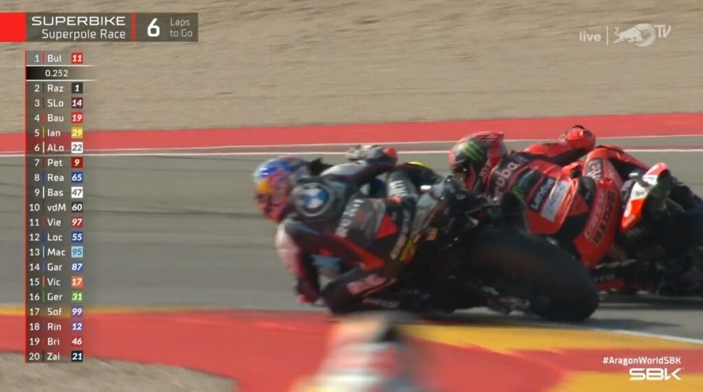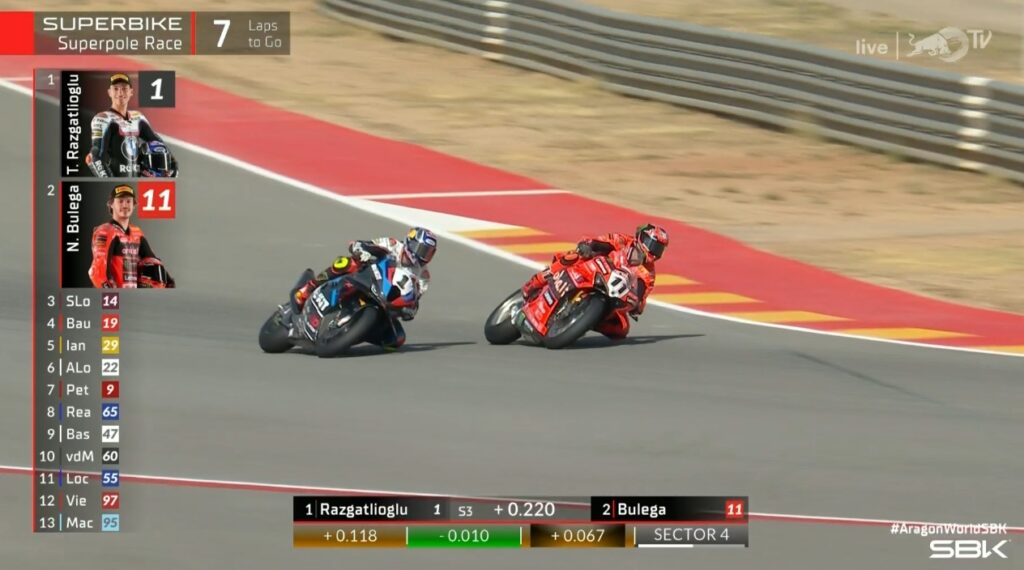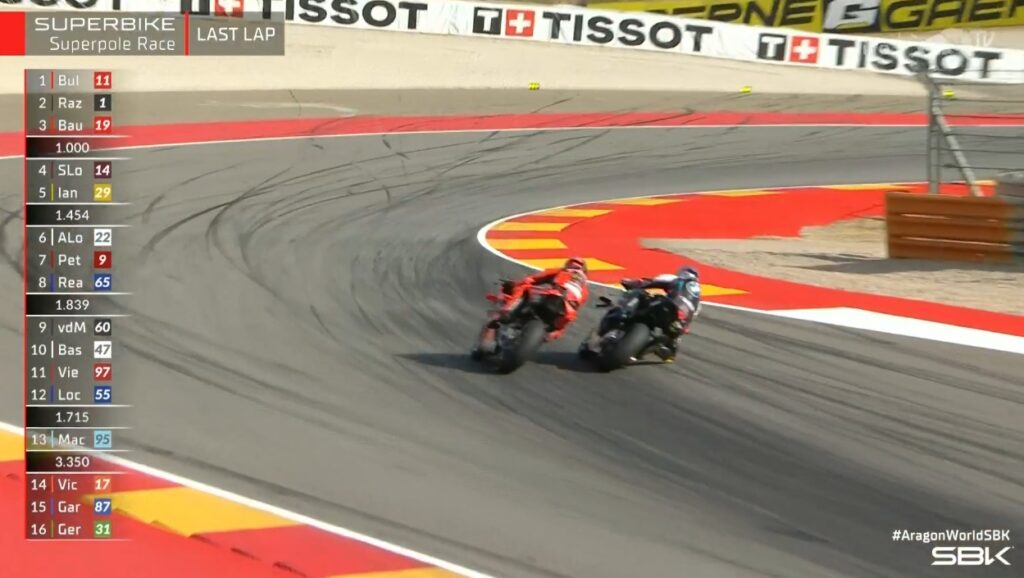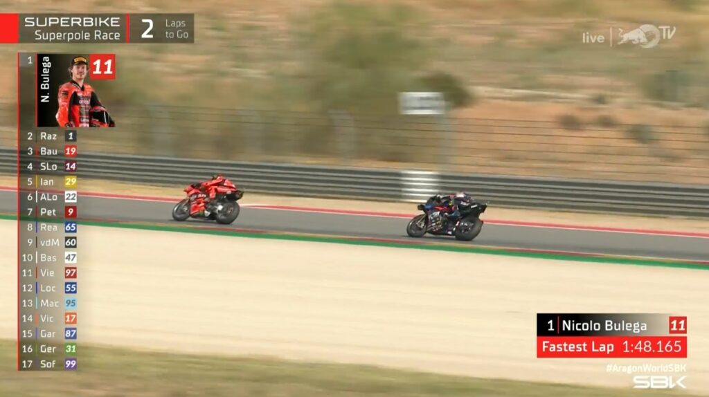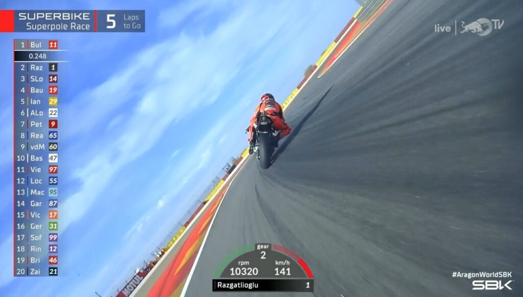 Et malgré son retard dans la ligne droite, Bulega va profiter à plein de la meilleure motricité de sa Ducati pour passer dans la dernière courbe :