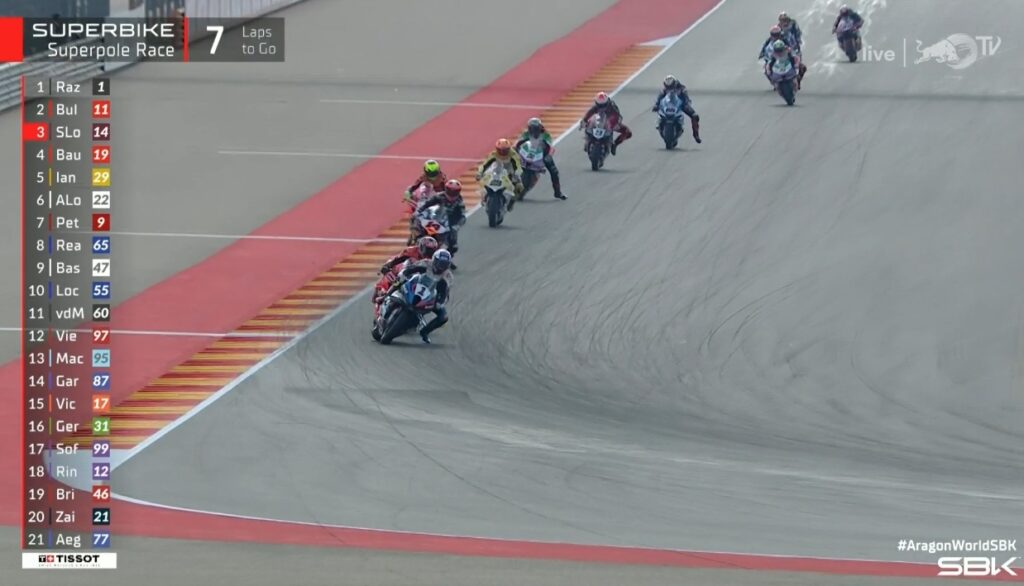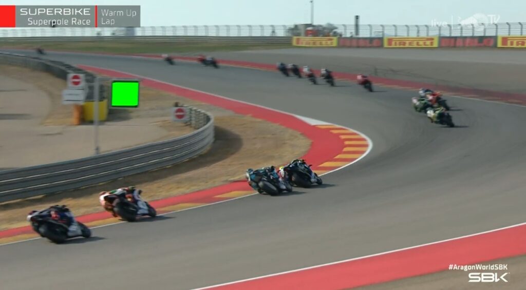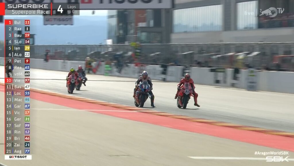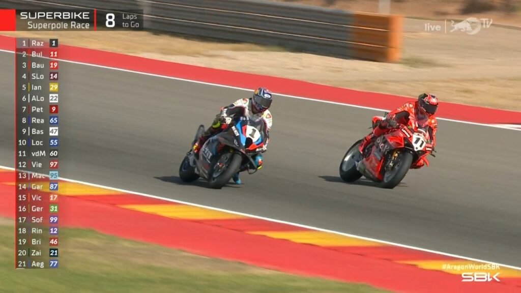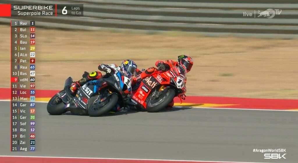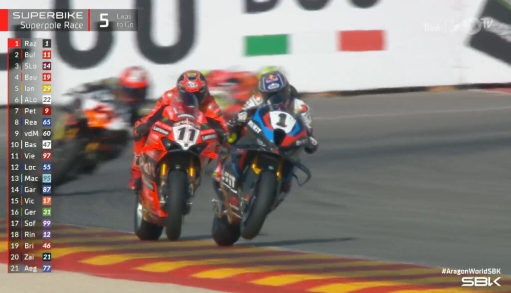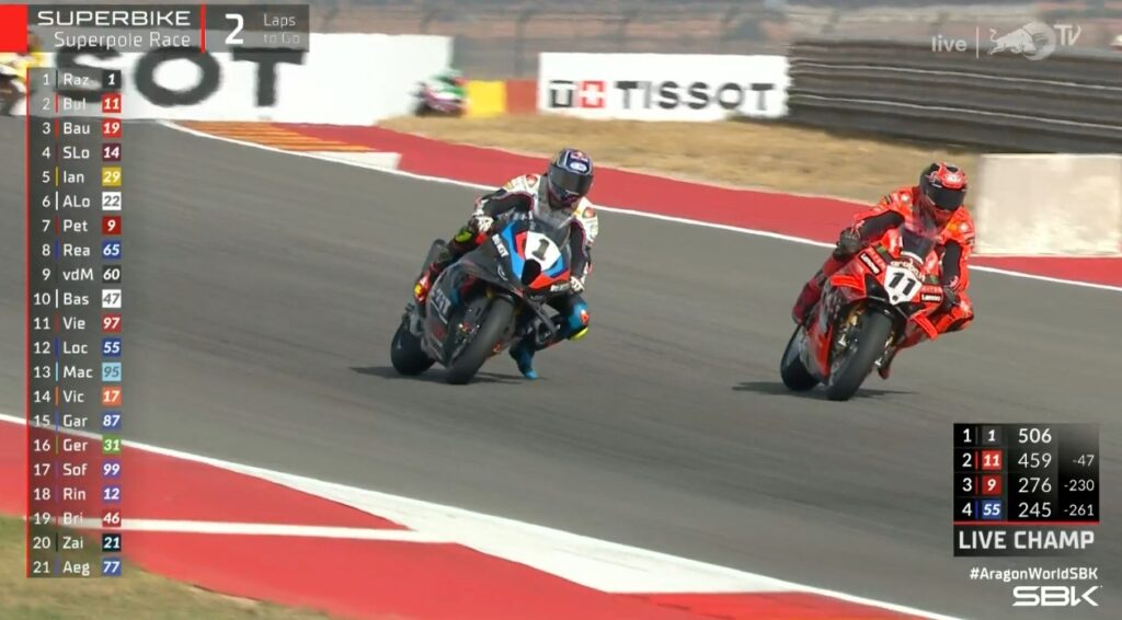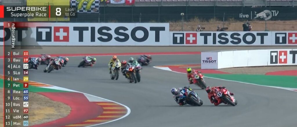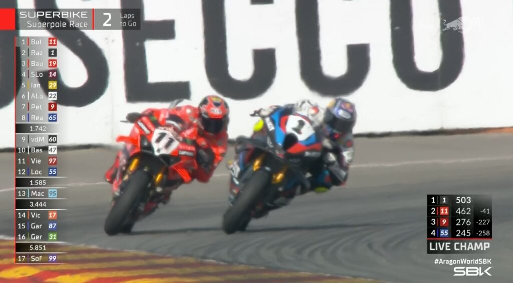 Et malgré son retard dans la ligne droite, Bulega va profiter à plein de la meilleure motricité de sa Ducati pour passer dans la dernière courbe :