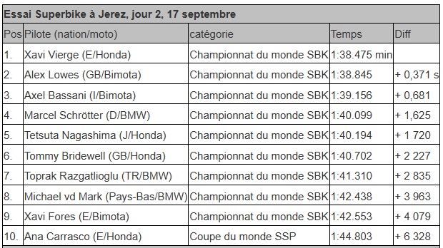 Sam Lowes second hier derrière Topak n’a pas roulé et c’est donc Xavi Vierge qui a réalisé le meilleur chrono devant les pilotes Bimota, il s’est approché à moins de 1/10ème du chrono du turc hier.