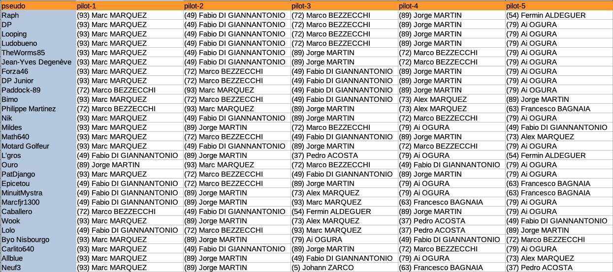 Tu as raison, je suis sur une mauvaise pente, de plus, avant de balancer mon vote, j’avais mis les 4 dans l’ordre (hors Marquez evidemment), et je me suis ravisé, j’aurai pu marquer 8 points, l’horreur.