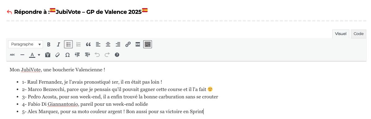 Enfin pas tout à fait, il reste à voter pour les pilotes de ce GP de Valence, en attendant un futur JubiVote global pour cette saison 2025 qu’on pourra comparer au classement général du JubiVote.