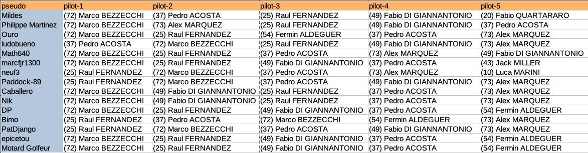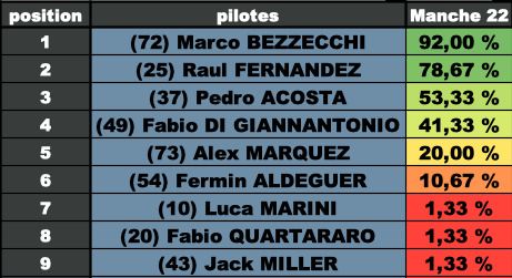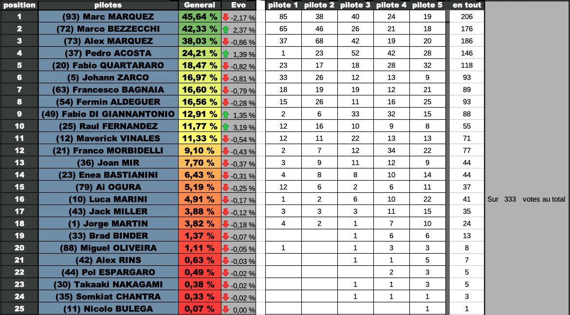 Alex Marquez a été en tête des votes 2 fois, comme Zarco, Quartararo et Bagnaia, puis Ogura, Viñales, Aldeguer et Raul 1 fois chacun, mais c’est 5 victoires pour Bezzecchi autant que Marc Marquez ! Ceci explique donc cela 🤗