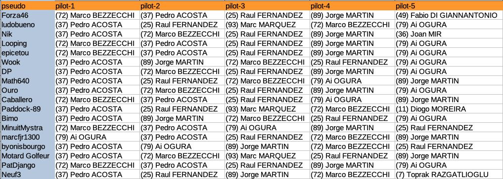 Je n’ai pas vu la course, ni suivi les essais, ni le sprint et encore moins l’intersaison ! Donc forcément pas d’inspi pour le jubivote, je sais seulement que je veux absolument voir y figurer Jorge Martin (je n’ai pas cru en lui pour le Jubi, je pensais qu’il en baverait sur la durée du GP, et je me suis trompé et c’est tant mieux (sauf pour mon score 😉😉😉 ) )