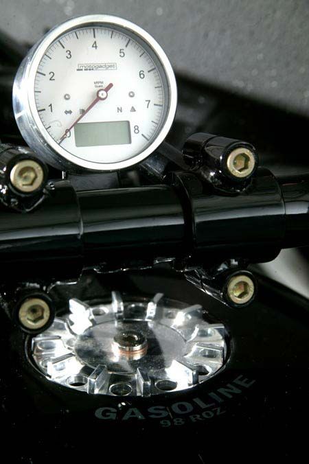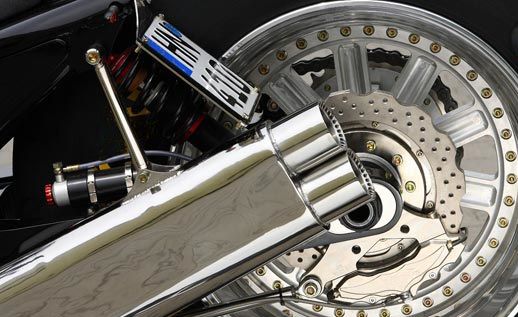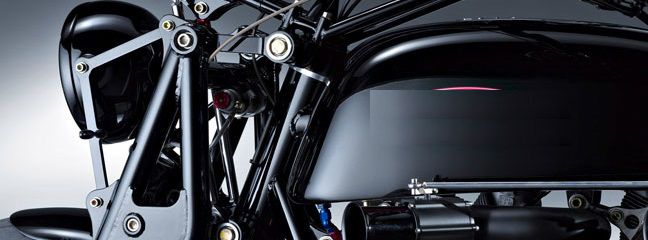 Bi-cylindre en V à 45°, pas de protection sur l’admission, pas de protection sur la transmission secondaire, pas de protection sur le système de freinage, ça ne semble pas être une moto pour rouler sous la pluie ou bien pour avoir un passager… ou bien un passager sans jambe droite.