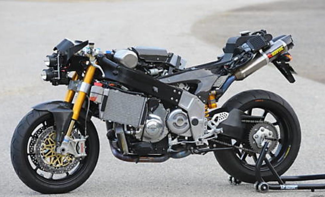 Je pense que c’est au moins des freins italiens (Brembo), la fourche avec l’étiquette bleue en bas on dirait du Öhlins, l’amortisseur aussi et les jantes ressemblent aux Marchesini des premières Panigales … Les radiateurs on dirait ceux d’une VTR et les pots sont Akrapovic …
