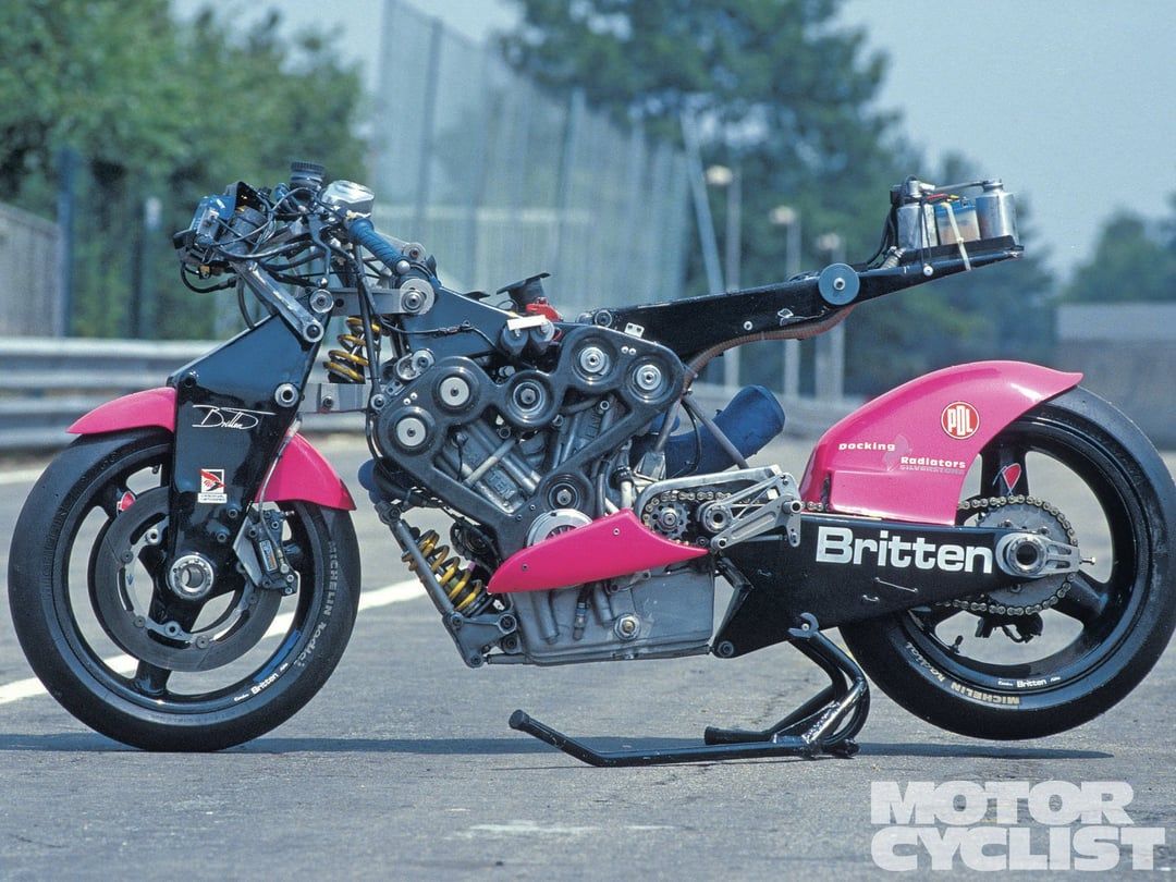 Le destrier à ses cotés est l’une ses créations : La Britten V1000, 166ch, 138kg équipé déjà d’une injection électronique, dépourvu de cadre, l’élément central de la moto étant son moteur et nous sommes début des années 90 ; moto victorieuses dans des épreuves Nationales et internationales! Des solutions inédites comme l’amortisseur arrière qui se trouve devant le moteur et le radiateur sous la selle.