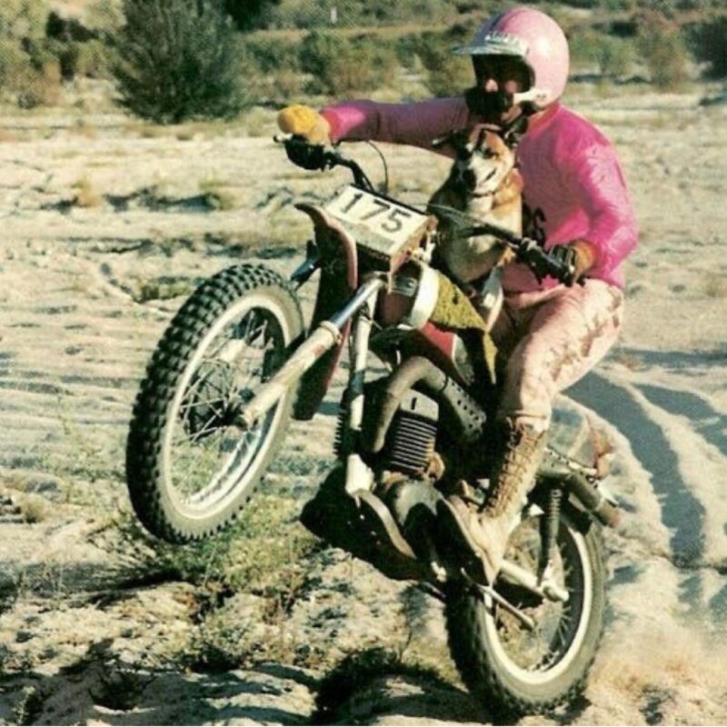 Alors tout d’abord désolé pour ce retard, j’ai du m’absenter hier, ai essayé de venir sur le site via mon téléphone hier soir, mais j’avais pas mes identifiants pour me connecter…ha le con…bref, donc c’est @Math640 qui a trouvé il s’agissait d’un pilote et son chien, John Mac Cown et Kookie, plus de 300 courses dans le désert avec le chien sur le réservoir !!! Intronisé au Hot Shoe Hall of Fame en 2021 :
