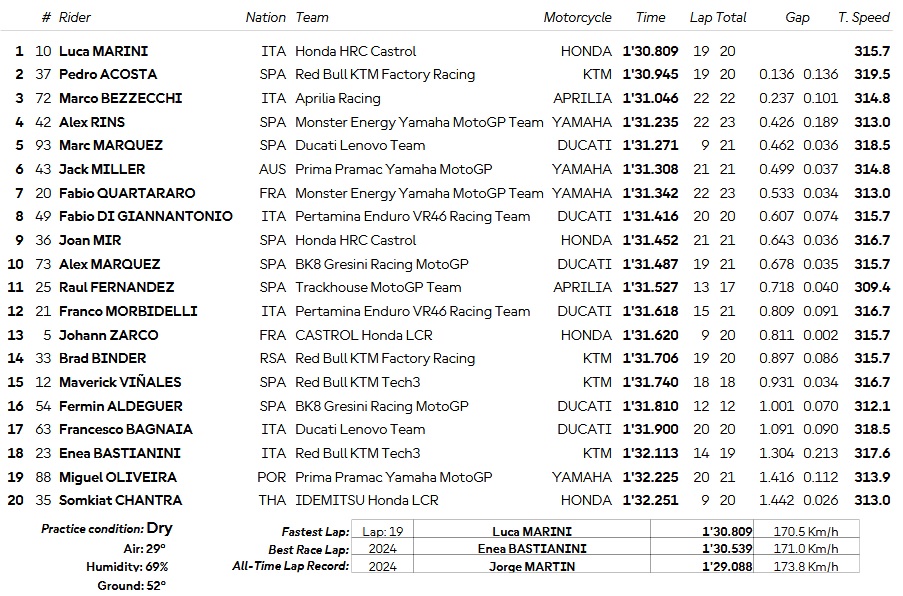 Il est suivi par Pedro Acosta qui a mis un pneu avant Medium neuf en fin de séance.