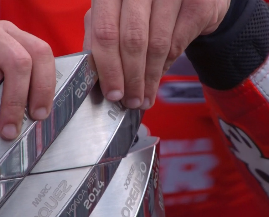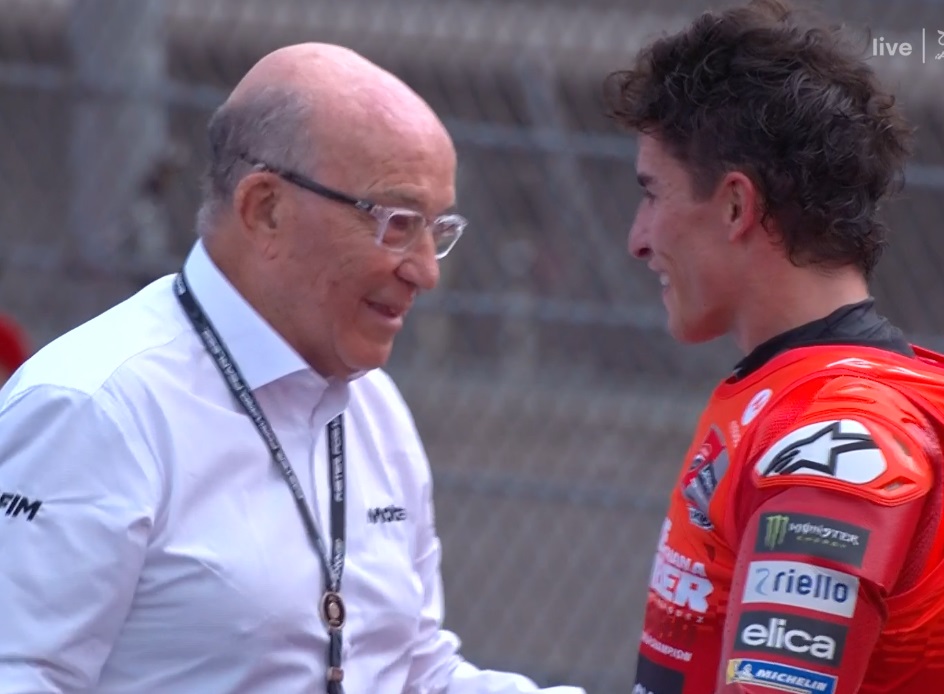 Carmelo Ezpeleta reçoit Marc Marquez pour rajouter l’objet du titre sur la grande coupe :