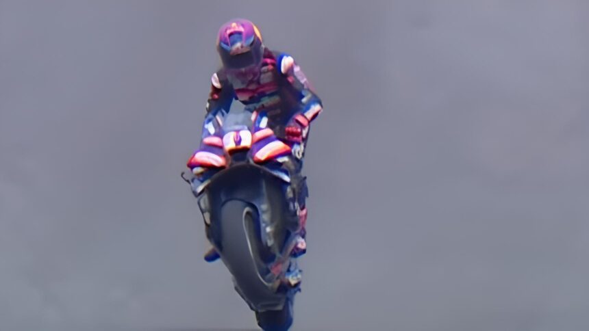 Jorge Martin dans la ligne droite opposée, la plus longue ligne droite du circuit et une des plus longues du calendrier a commencé une roue arrière à basse vitesse mais a accéléré jusque 190 km/h.