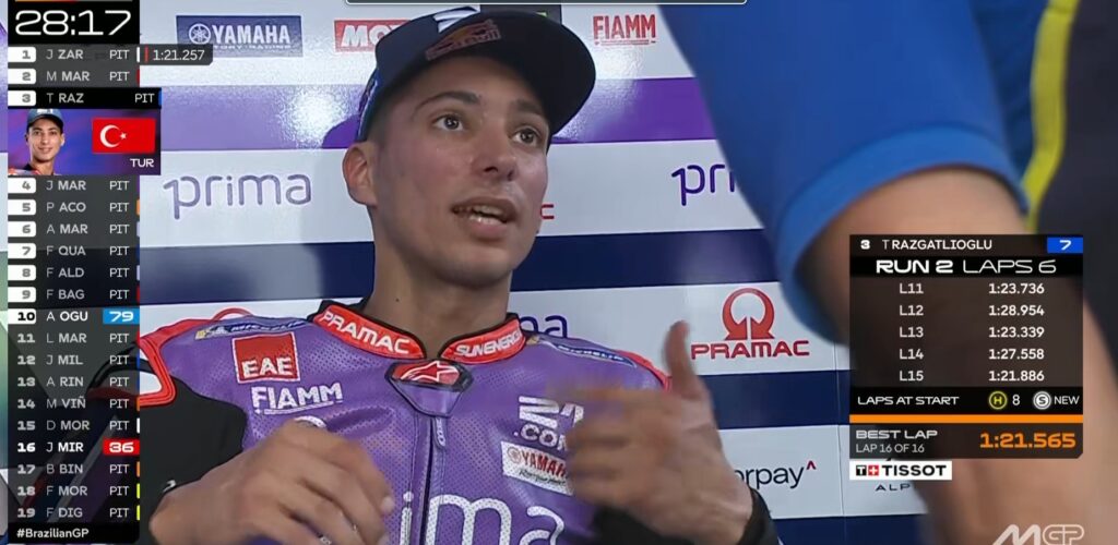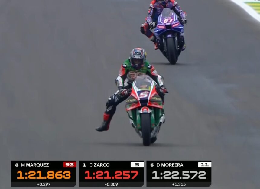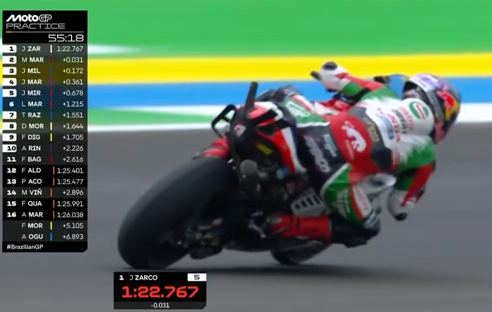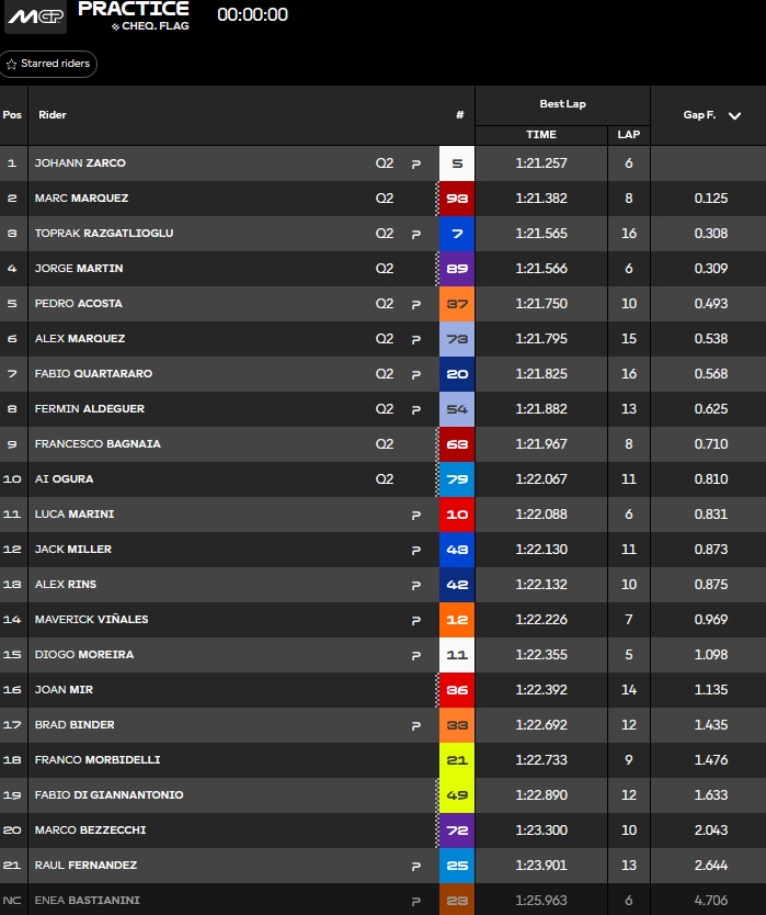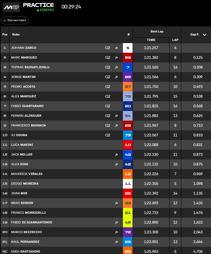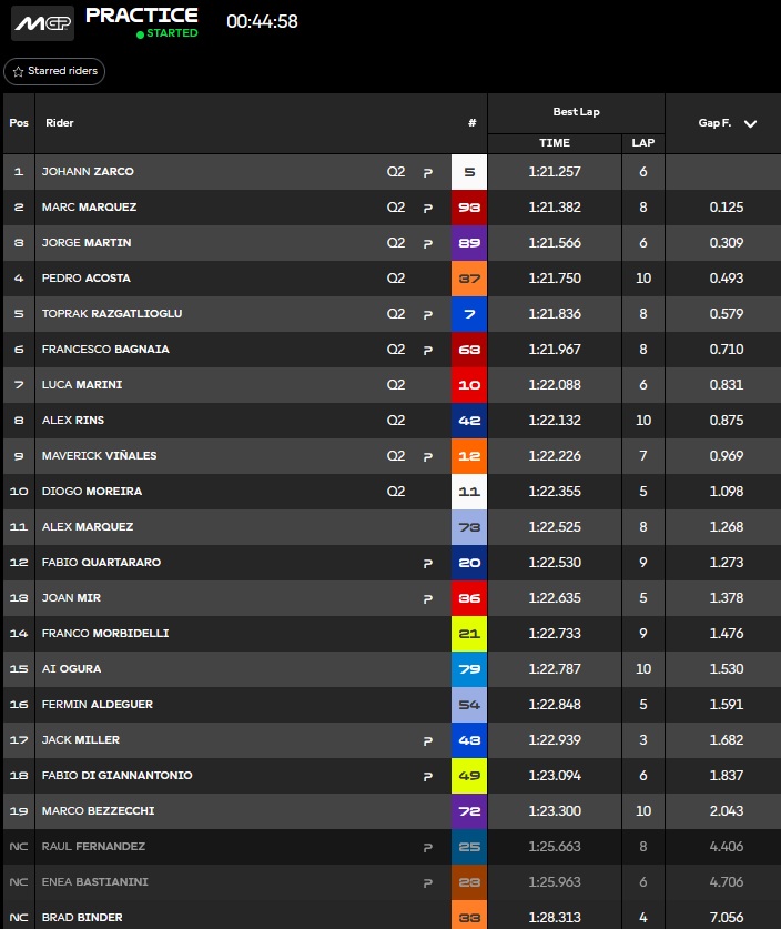 Ce classement de dingo, Zarco tout en haut, les 3 autres Honda hors du top 10, les VR46 dans les choux, les Tech3 pas mieux, Bestia même pas de chrono. Bezzecchi vingtième, il n’y en a que deux qui passeront en Q2, beaucoup de candidats…