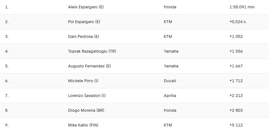 A la fin de cette journée, Aleix Espargaro sur sa Honda a nettement fait le meilleur temps devant son frère Pol et Dani Pedrosa sur leur KTM.