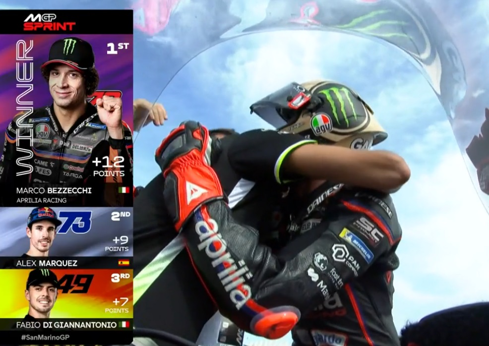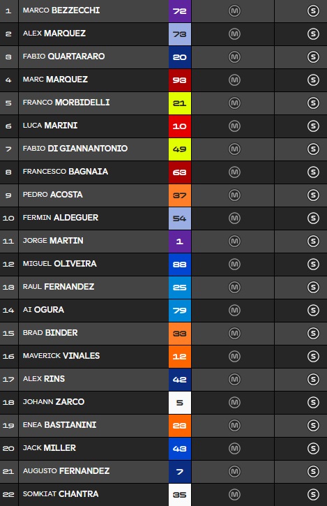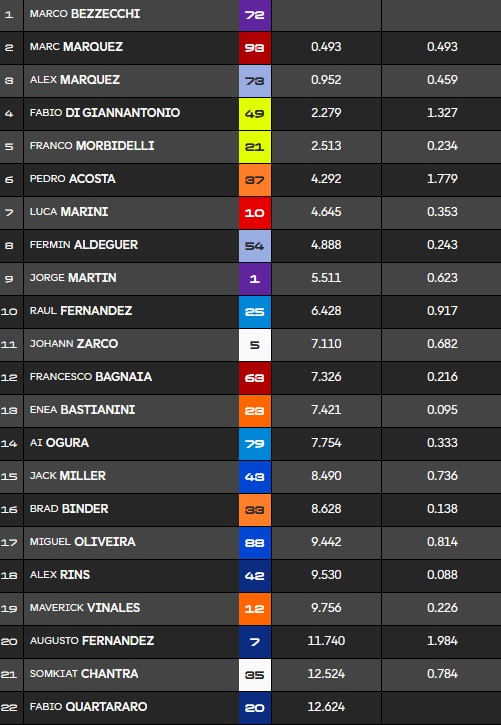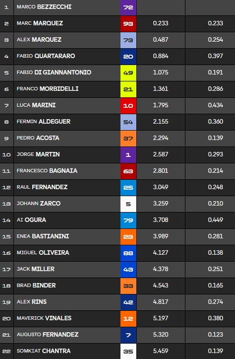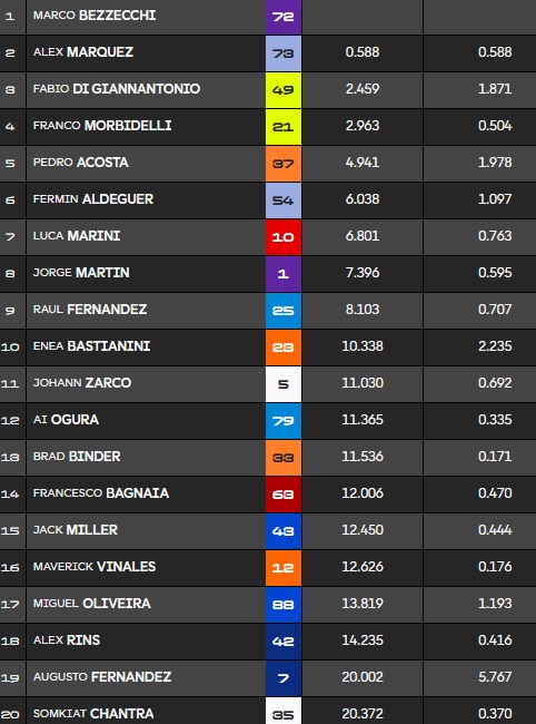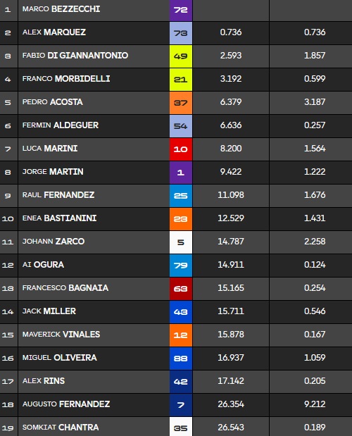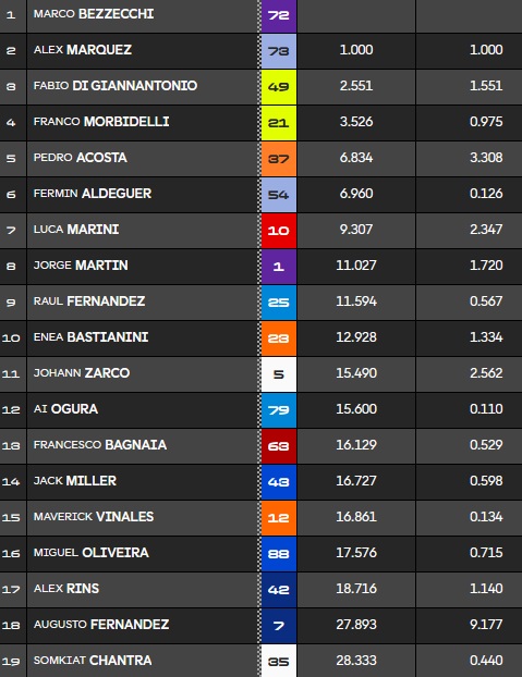 Vue vite fait hier soir en rentrant du boulot. Une petite erreur de Marc qui profite à Bezz. Belle vivtoire de l’Italien qui a tenu la dragée haute dans tous les cas. Derrière Alex assure la 3ème place et la VR46 suit en ordre de bataille. Dommage pour Fabio qui a tout donné en Q2 en encore en sprint. Les Katoches pas à la fête Honda progresse avec Marini. Même Z a fait une remontée correste maisbrestevà la porte des points.