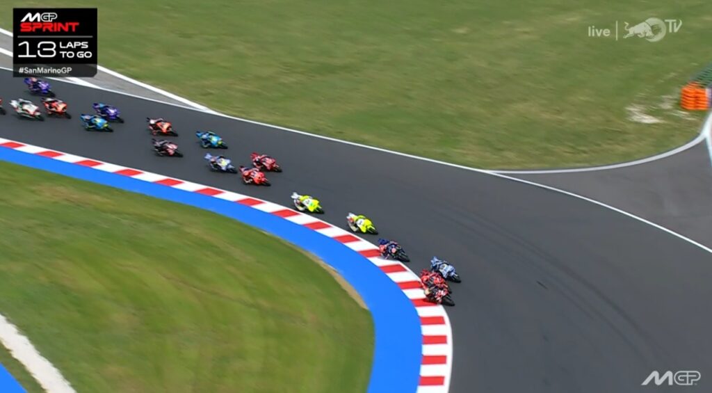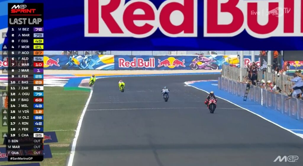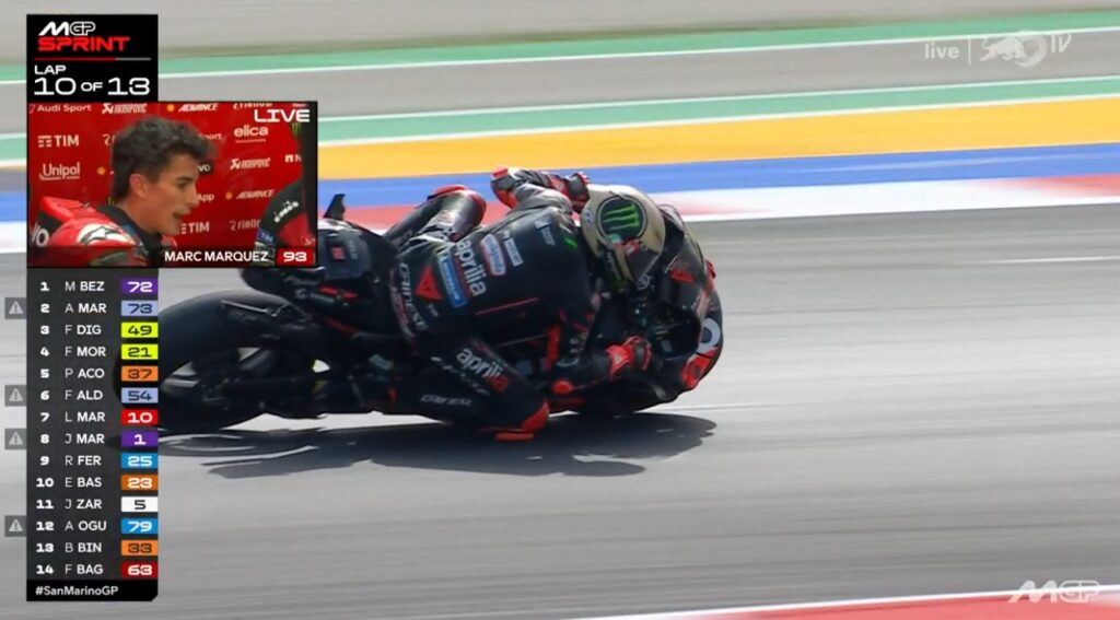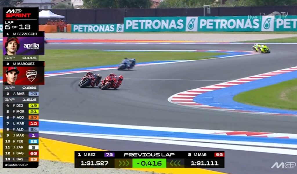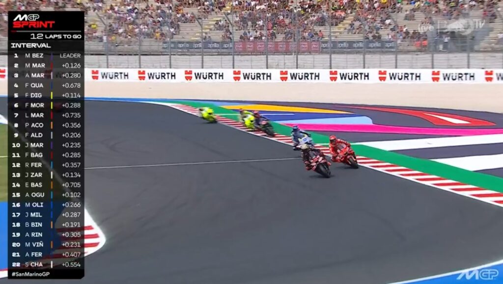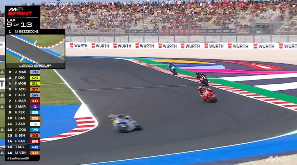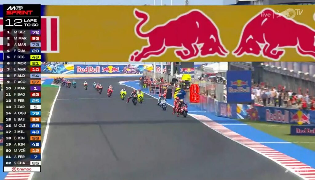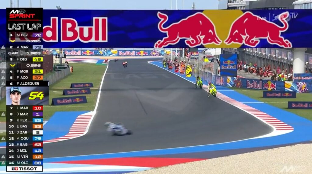 Alex Marquez vire en tête mais Bezzecchi le repasse et Marc lui fait l’extérieur dans le virage 2 :