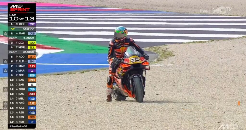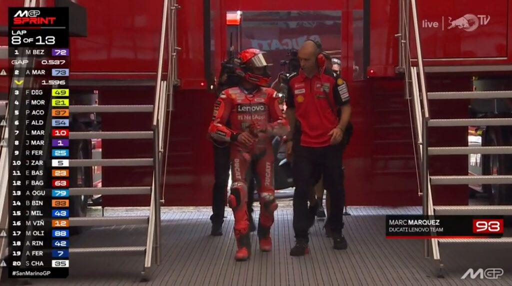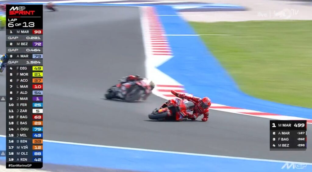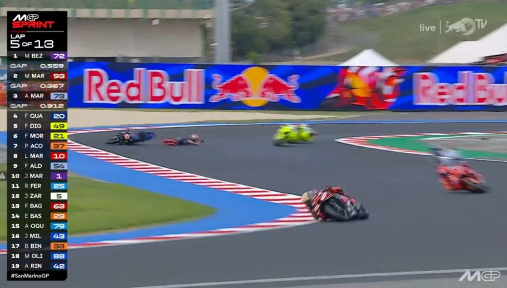 Alex Marquez en a parlé après sa seconde position et Marc a dit la même chose, son pneu avant derrière Bezzecchi est trop monté en température et quand il tombe, il n’avait pas assez refroidi et vu comment Marc attaquait ce virage à gauche, cela n’est pas passé.