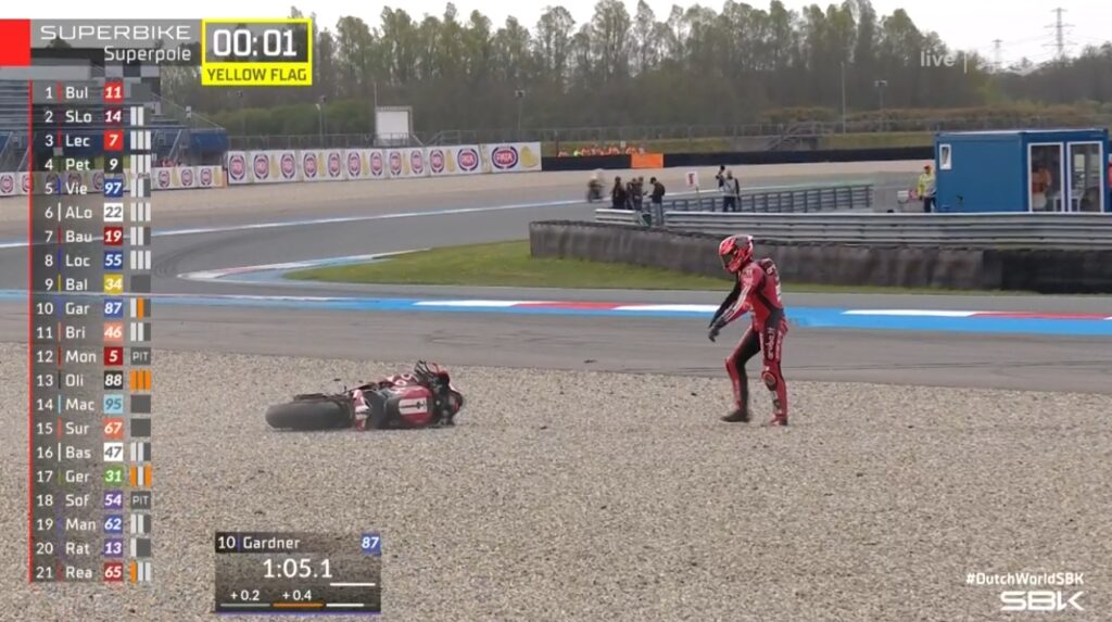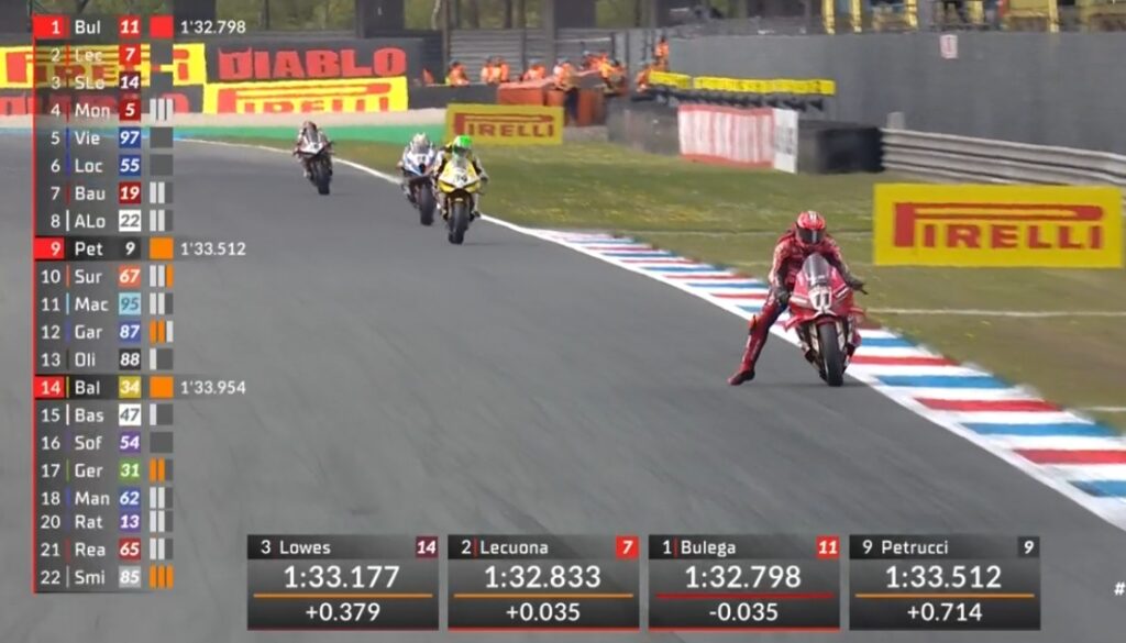 Après un tour de décélération, Bulega repart à l’attaque mais fait une faute dans le virage 1 :
