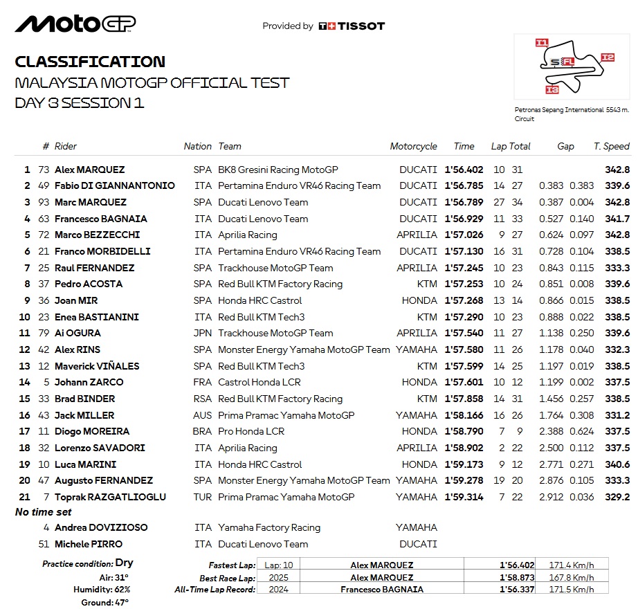 Et lors de la session du matin, Alex Marquez a battu le meilleur temps du test de 2025 mais il reste à 7 centièmes du record absolu de Pecco Bagnaia qui date du test de 2024.